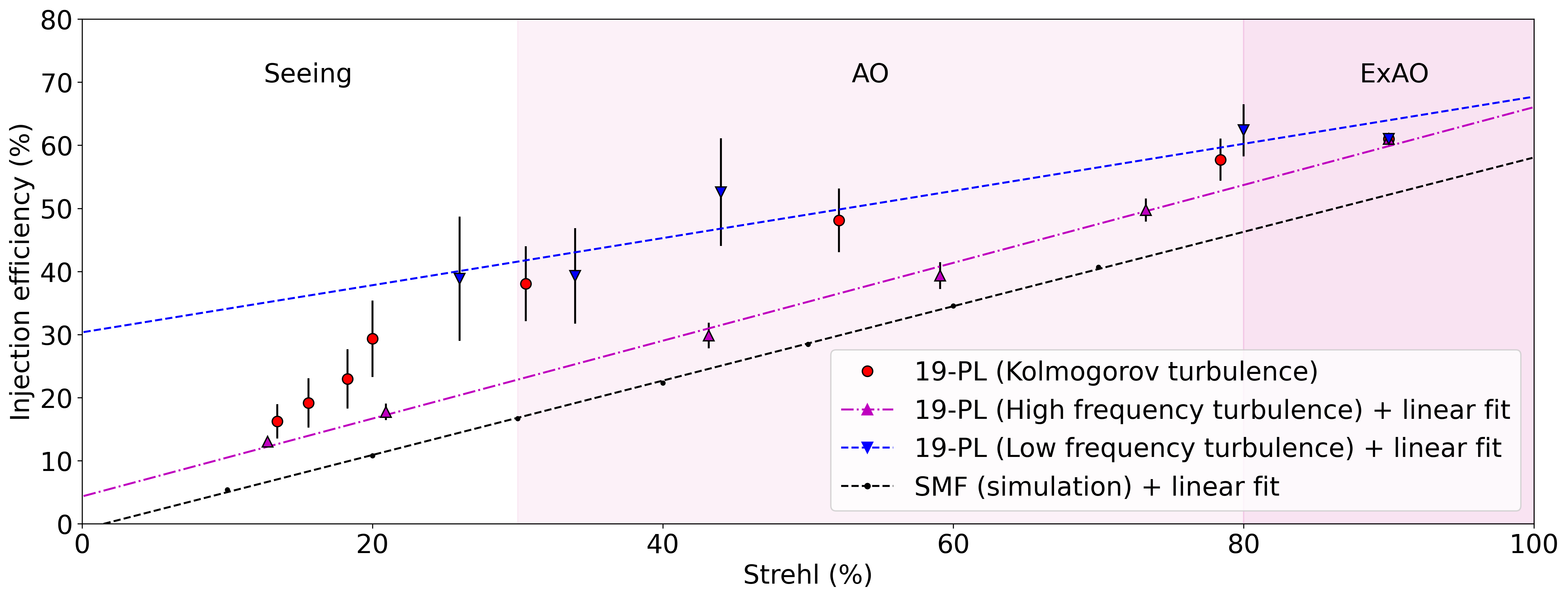 Figure 4 : Relationship between the injection efficiency at 642 nm and the Strehl ratio measured at 750 nm for various atmospheric conditions. The turbulence is applied on the SCExAO DM and the flux is recorded at the 19-port PL output. The presented SMF results are simulations from Lin et al. (2021), where the simulated turbulence screens were following the Kolmogorov power spectrum.