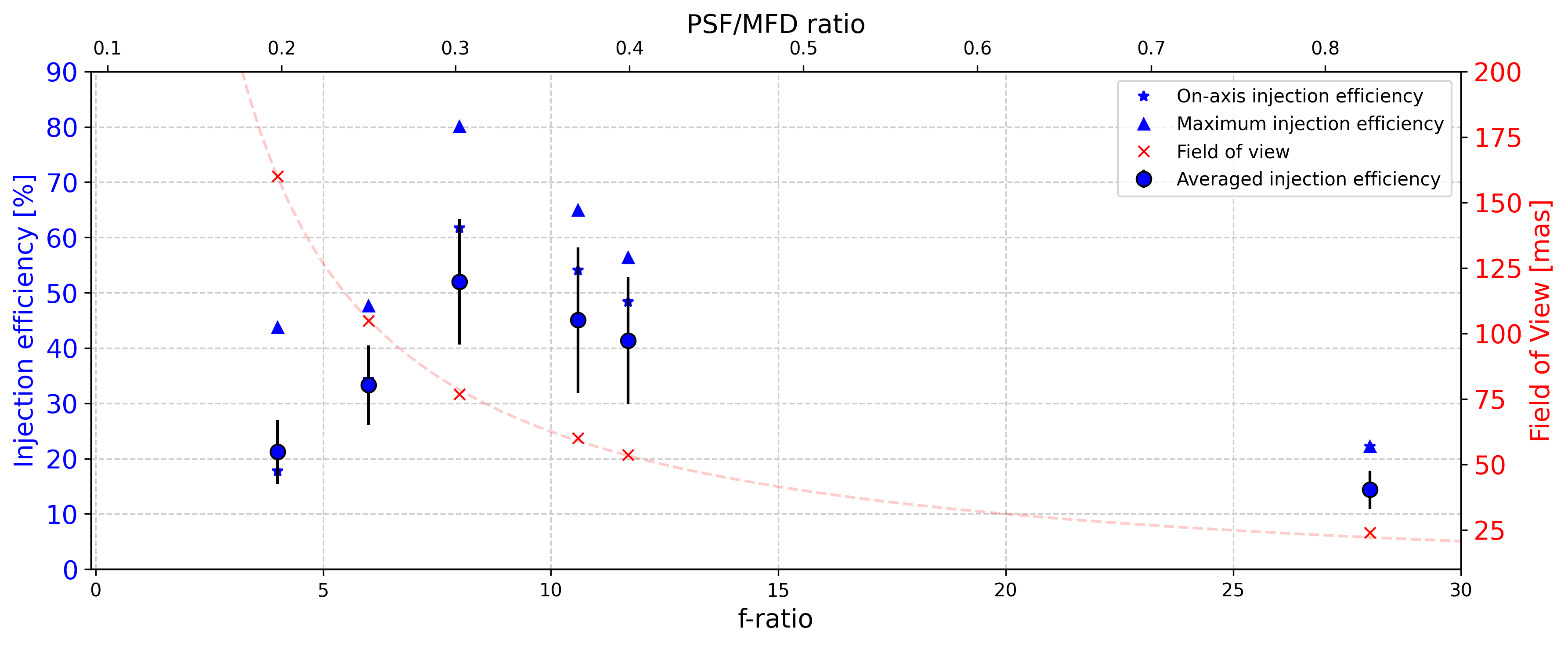 Figure 3 : Variation of the injection effciency measured at 642 nm as a function of the focal ratio (bottom horizontal axis), or as a function of the ratio between the PSF size and MFD of the PL (top horizonal axis). For each focal ratio experimentally tested, we represent the on-axis injection efficiency, the maximum efficiency and the average over the whole scanned area. The field of view projected on-sky is also plotted with red crosses (right axis).