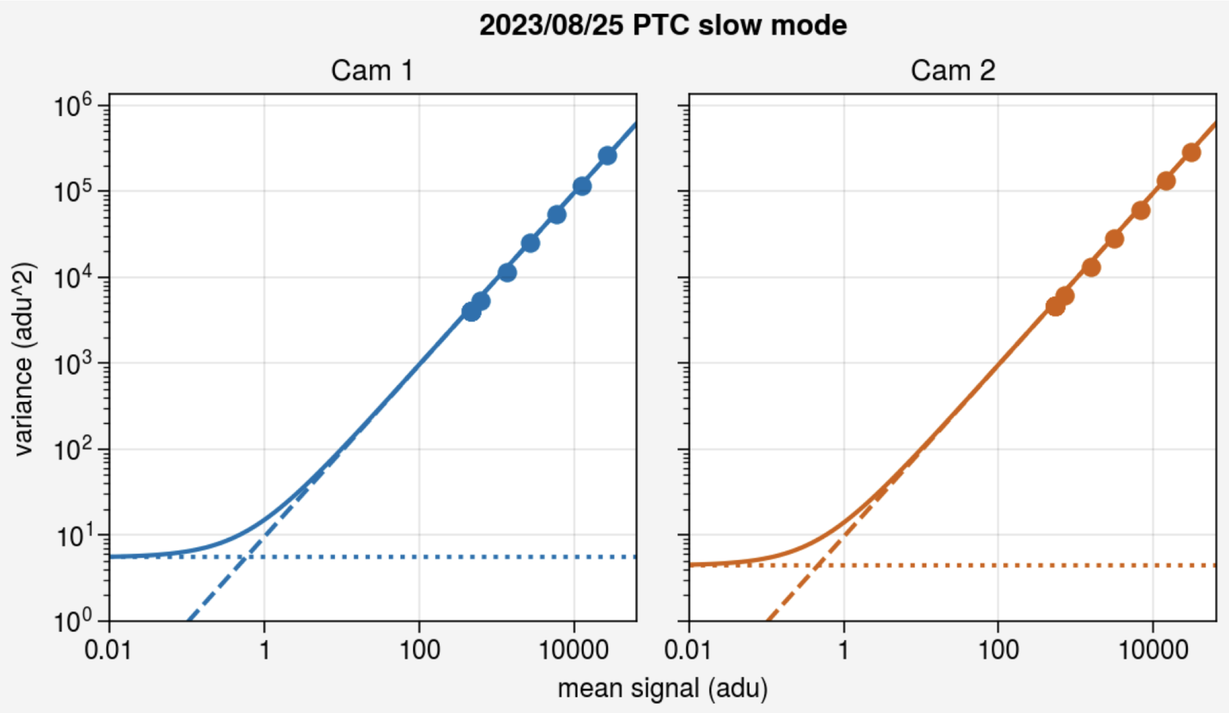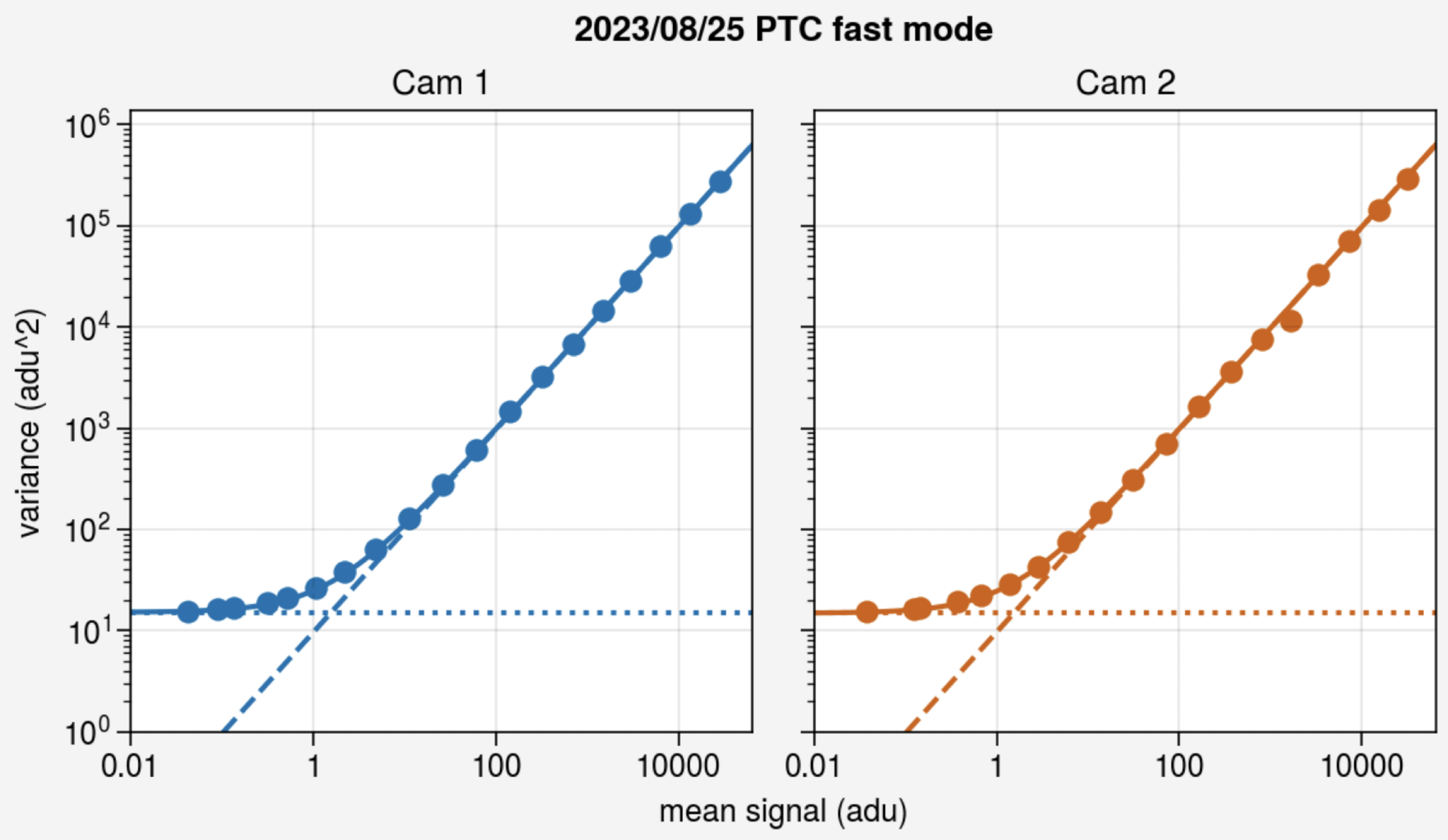 These photon transfer curves were fit with the use of frame-differencing to remove the fixed pattern noise. The bias is not estimated from any light frames, but from a bias frame directly after fitting the gain.